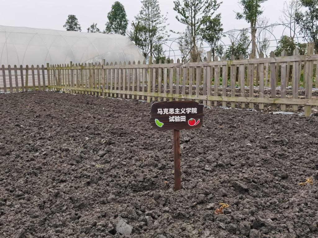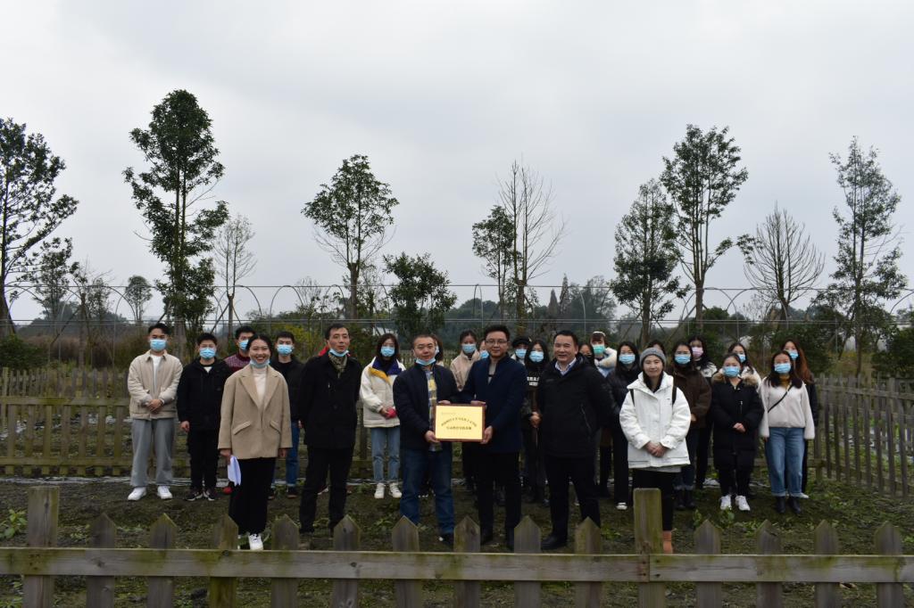 马克思主义学院党总支书记雷栋良和温江区富农蔬菜专业合作社负责人一起为马克思主义学院劳动教育实践基地挂牌。