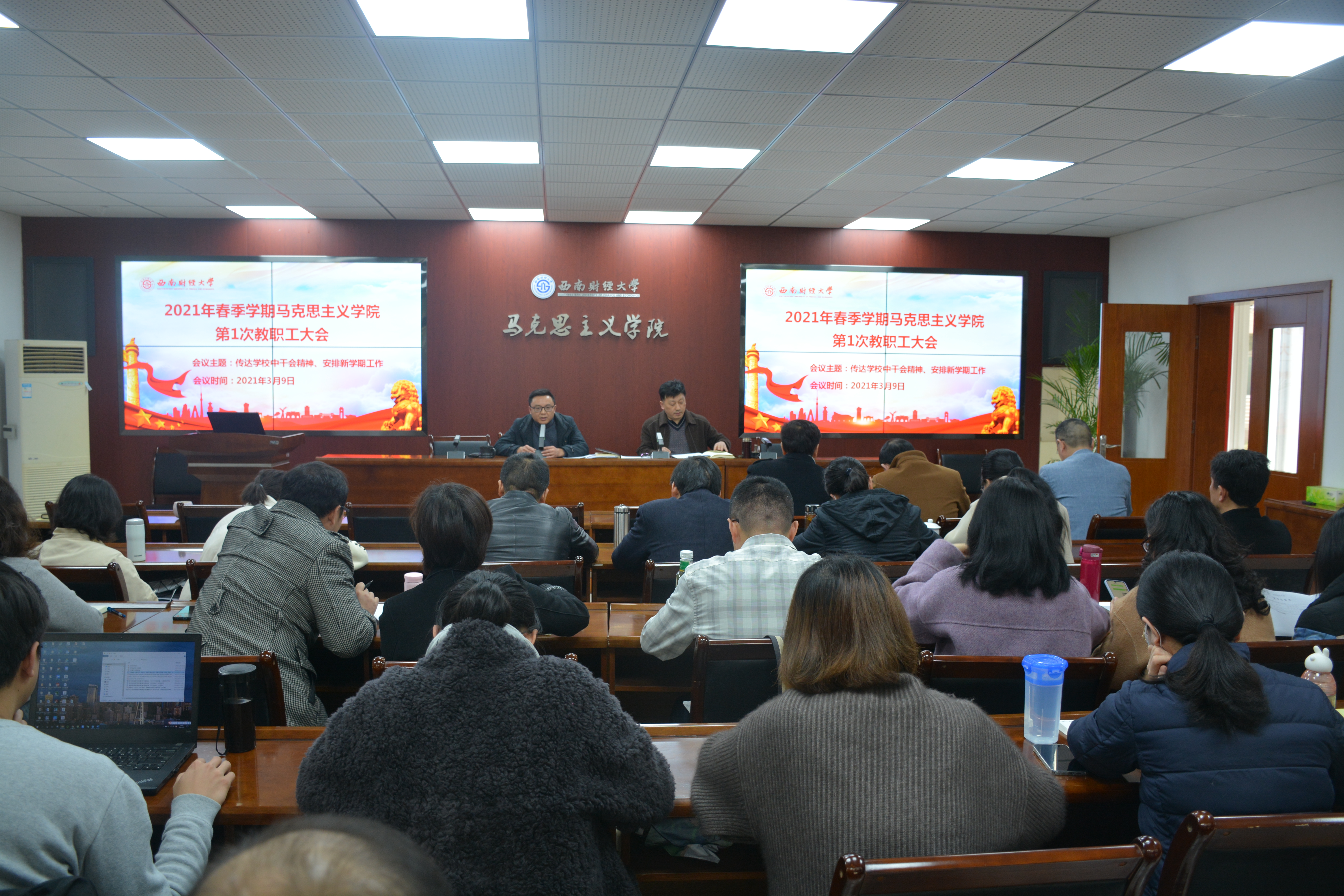 3月9日日下午,马克思主义学院在通博楼A117会议室召开全院教职工大会,深入学习贯彻党的十九届五中全会精神和学校十三届三次党代会精神,集中学习学校中干会精神,安排部署新学期工作。全体教职工参加会议,党总支书记雷栋良主持会议。