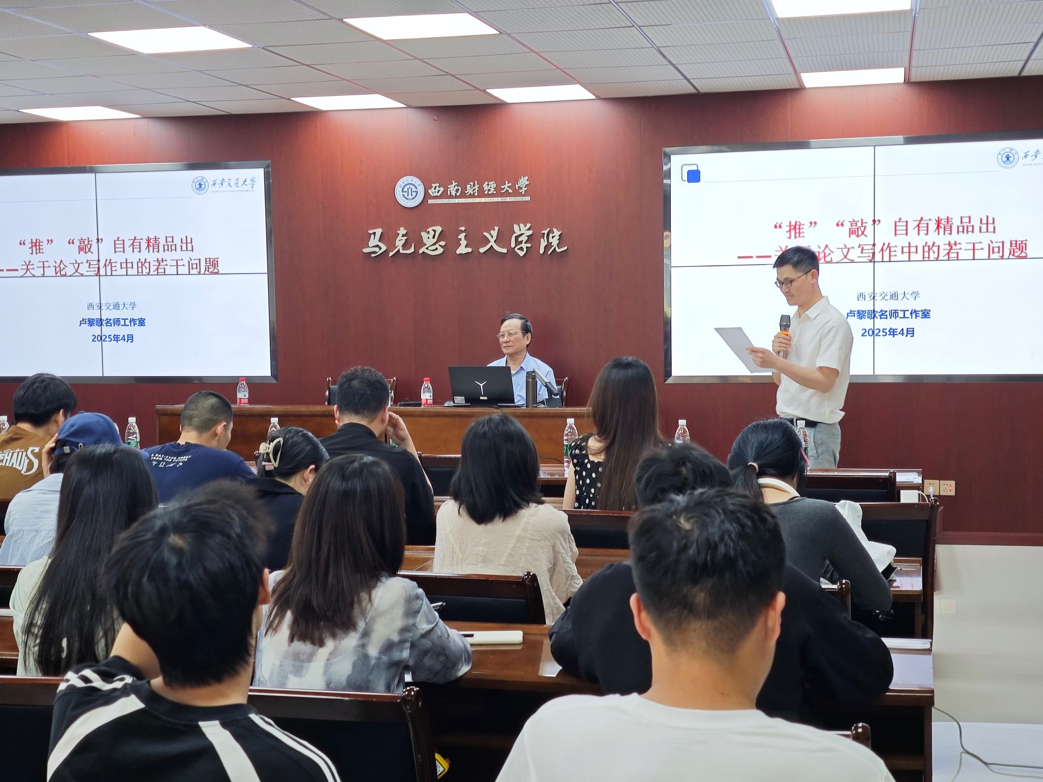 4月18日下午,西安交通大学二级教授、国家教学名师卢黎歌教授应邀做客我校“百年校庆杰出学者”讲座,在通博楼A117会议室作题为《“推”“敲”自有精品出——关于论文写作的若干问题》的学术报告。马克思主义学院胡建教授主持讲座,60余名师生现场聆听。