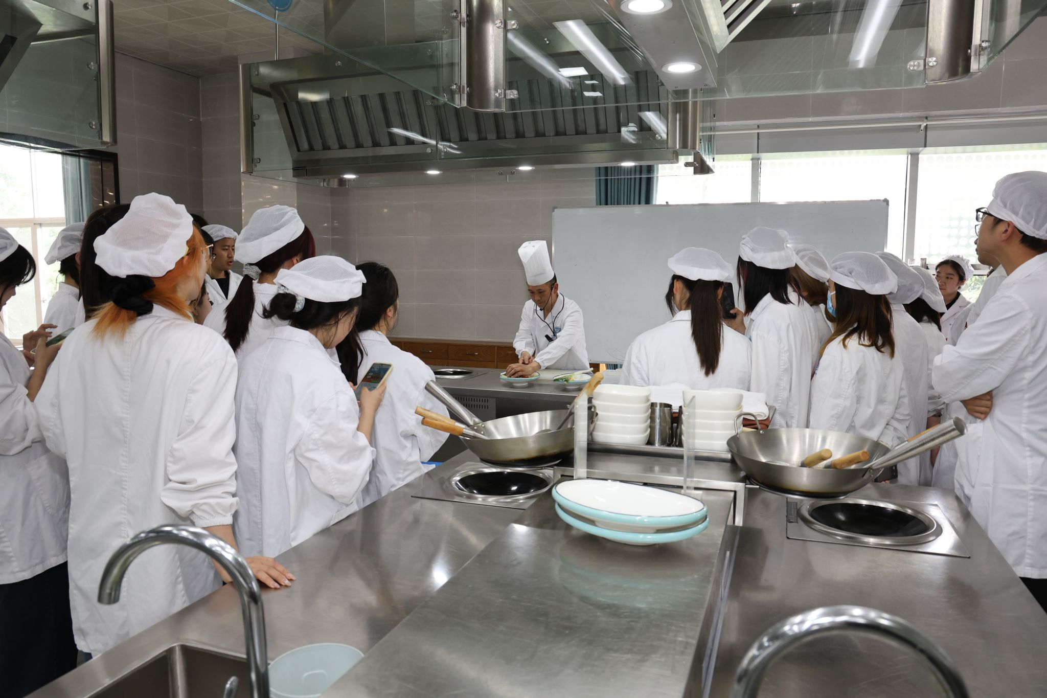 比赛分为三个环节。首先由后勤专业老师进行现场教学,参赛选手认真观摩学习。随后进行实际操作,各组选手在1个小时之内完成规定菜品—辣子鸡。选手们各展身手,切菜声与油爆声交织,翻腾的火焰与选手们制作佳肴的身影相映成趣。最后评委老师进行现场点评,通过“色”“香”“味”“形”这四个方面进行综合评价。